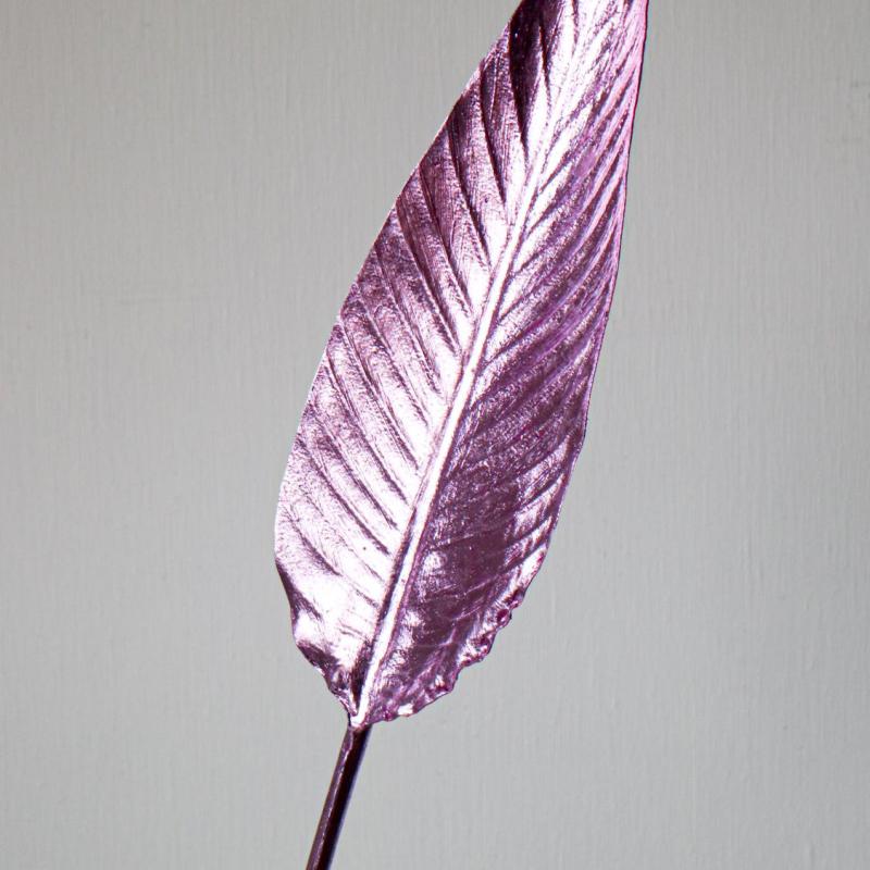 The Dawn Leaf is both a floral stem and a sculpture, depending on the styling. Beautiful as a stand-alone piece but also works well in a bouquet, adding some edge. The stem is thick, tall, and straight, and the metallic leaf is enlarged, making the design surrealistic and sophisticated.