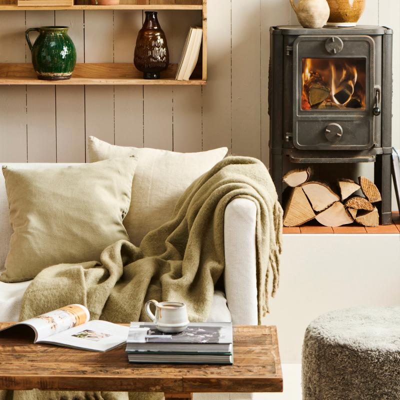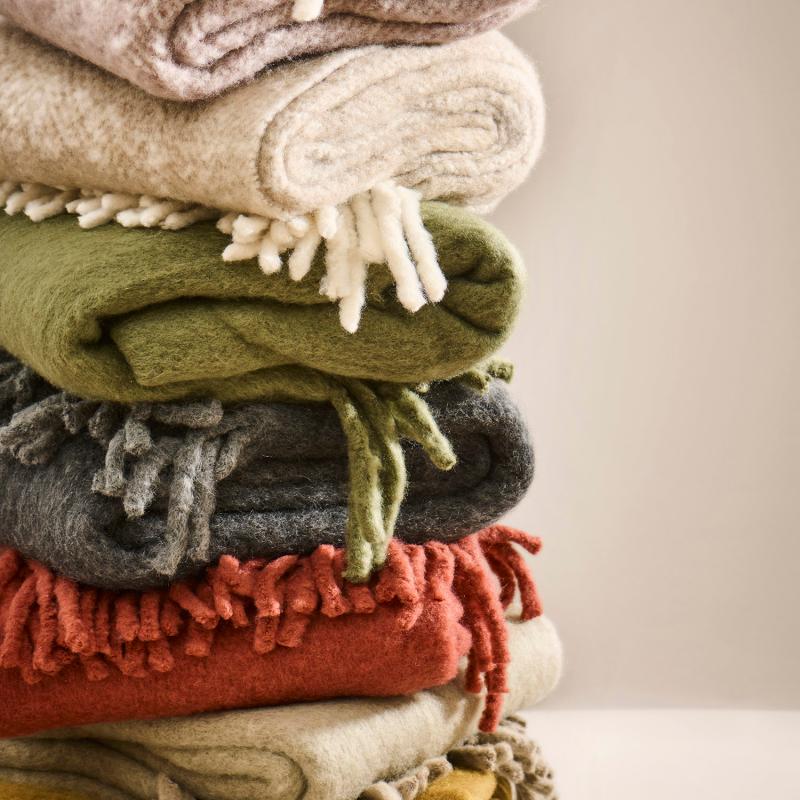 Blød og let klassisk plaid fremstillet i en uldblanding i en olivengrøn farve og med frynser. Måler 170 x 130 cm, og er lavet i 55% uld, 30% akryl, 15% nylon.