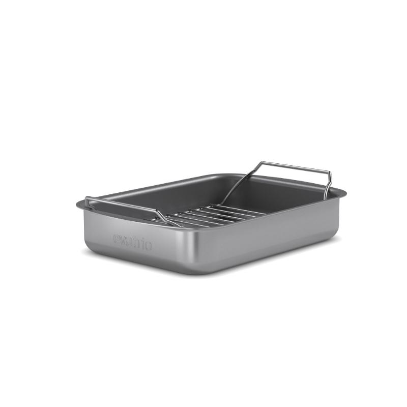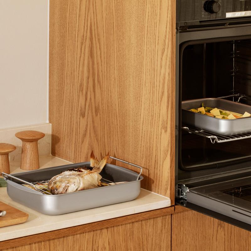 Uanset om I tilbereder grøntsager, steger grillkylling eller bager fisk leverer vores professionelle bradepande det perfekte resultat. Den slidstærke keramiske Slip-let®belægning (helt uden flourstoffer) sikrer, at maden slipper hurtigt og nemt, tåler op til 400 grader og gør rengøringen legende let. Den medfølgende stegerist sørger for, at kød og fjerkræ ligger plant og hævet over bunden. Når maden er færdig, sætter I bare fadet i opvaskemaskinen.