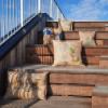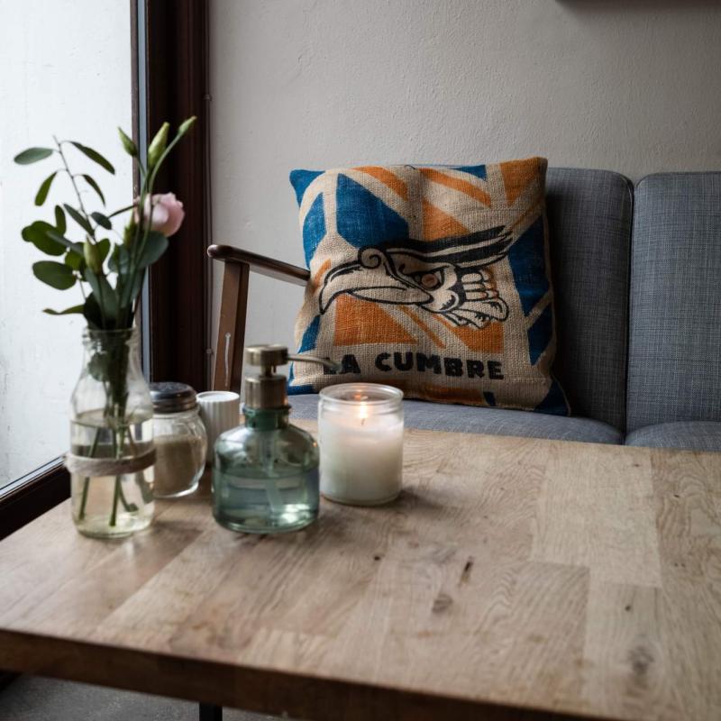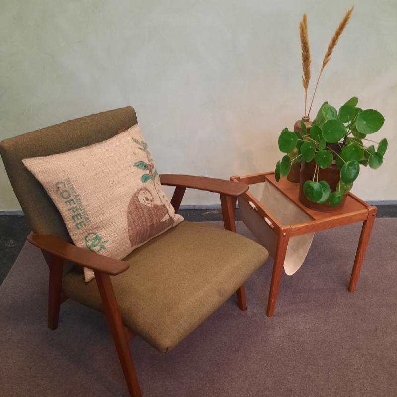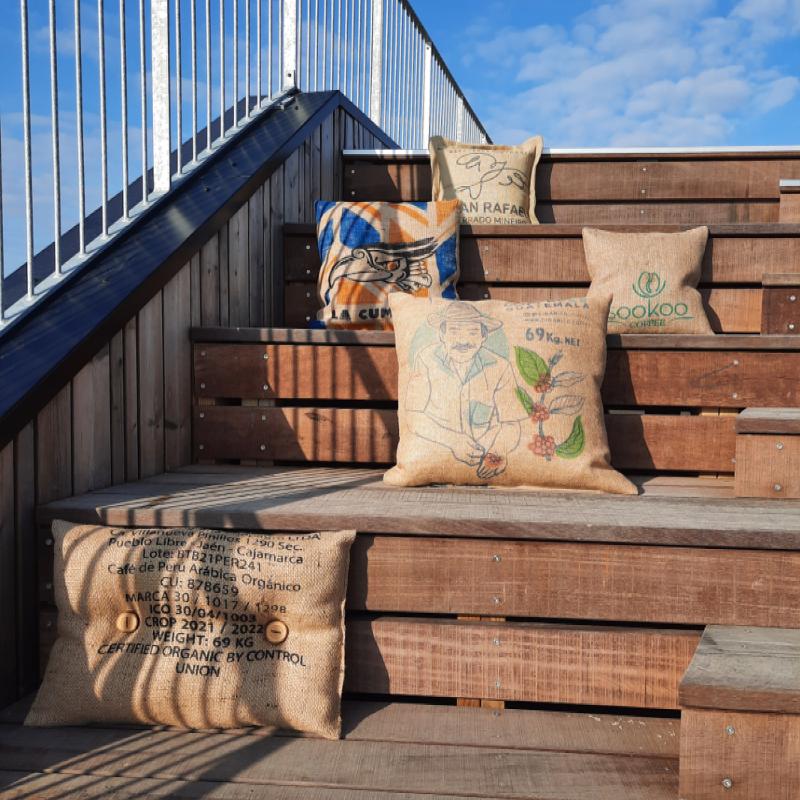 arrow_backTil oversigtenPyntepude betrukket med stof fra kaffesække kombineret med rester fra regntøjsindustrien. Syet her i Danmark ud fra printet på den enkelte kaffesæk. Monteringspuden er danskproduceret med kunstfibre af genanvendte plastikflasker.