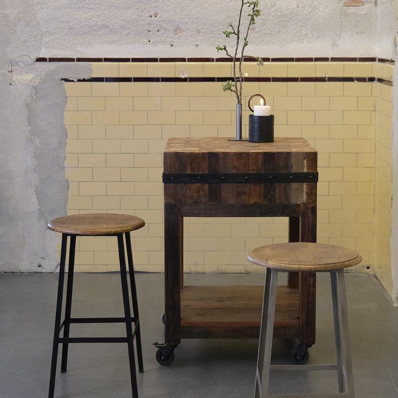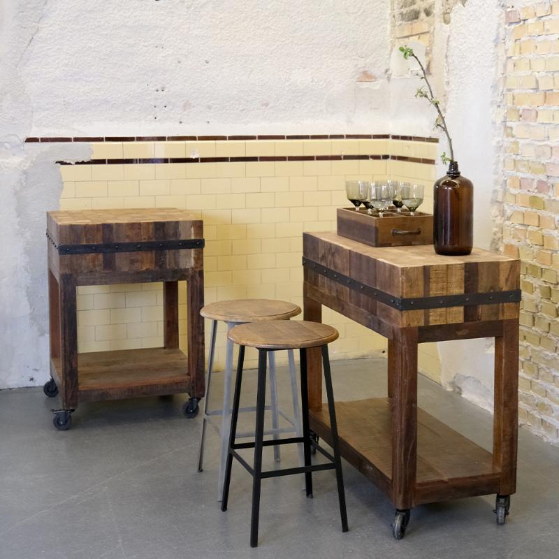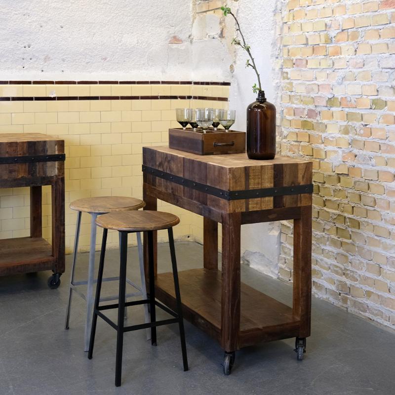 arrow_backTil oversigtenMed det solide genanvendte træ, de sorte metalbånd og praktiske hjul er vores nye slagterblokke både rå og anvendelige. Brug dem til præsentation af mad og drikke, som stående taffelbord eller som fleksibelt arbejdsstation i caféen eller restauranten.