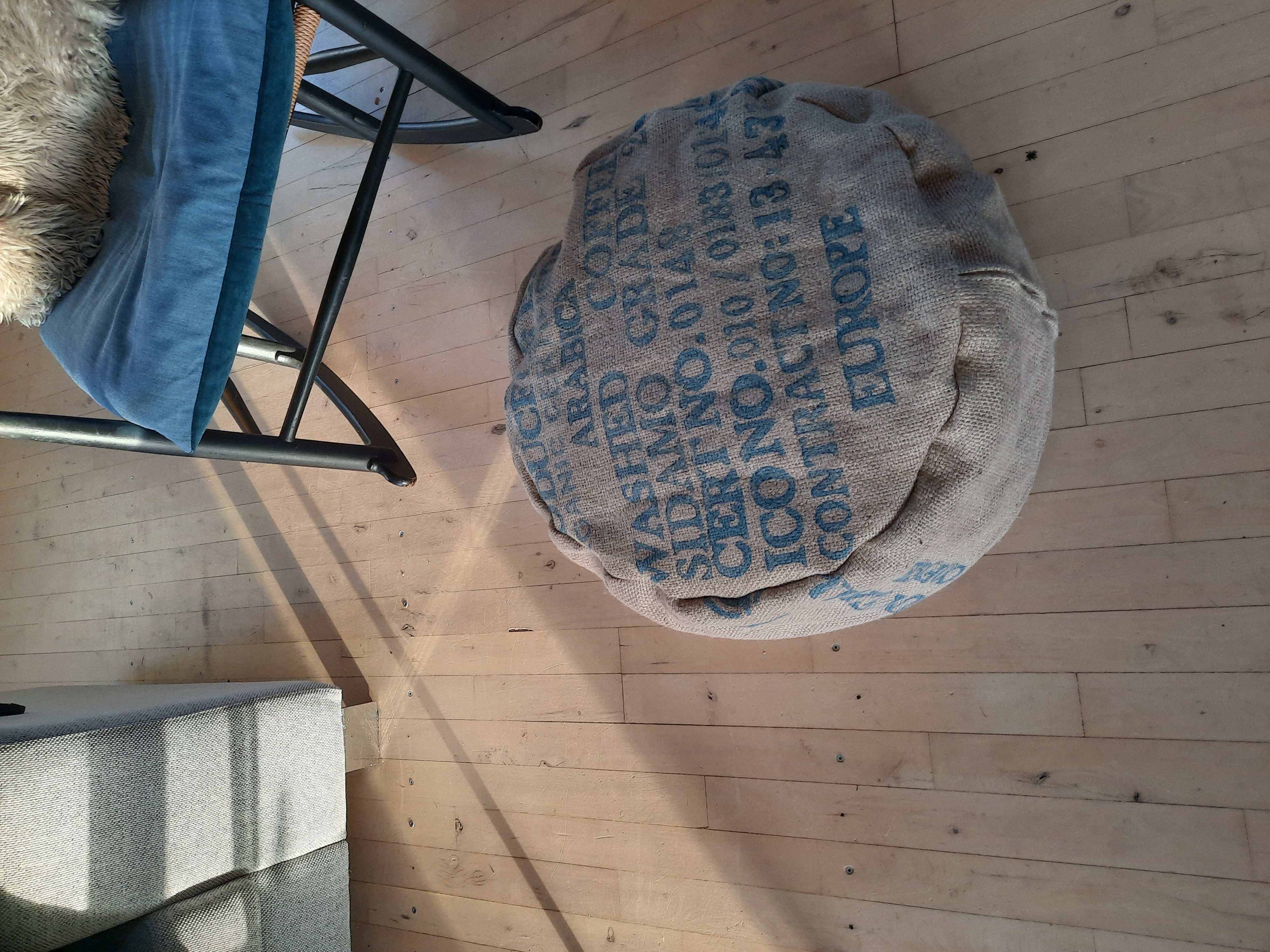 Af stof fra kaffesække fra danske mikroristerier med inderpose af rest tekstiler og fyldt med krøjerkugler her i Danmark.