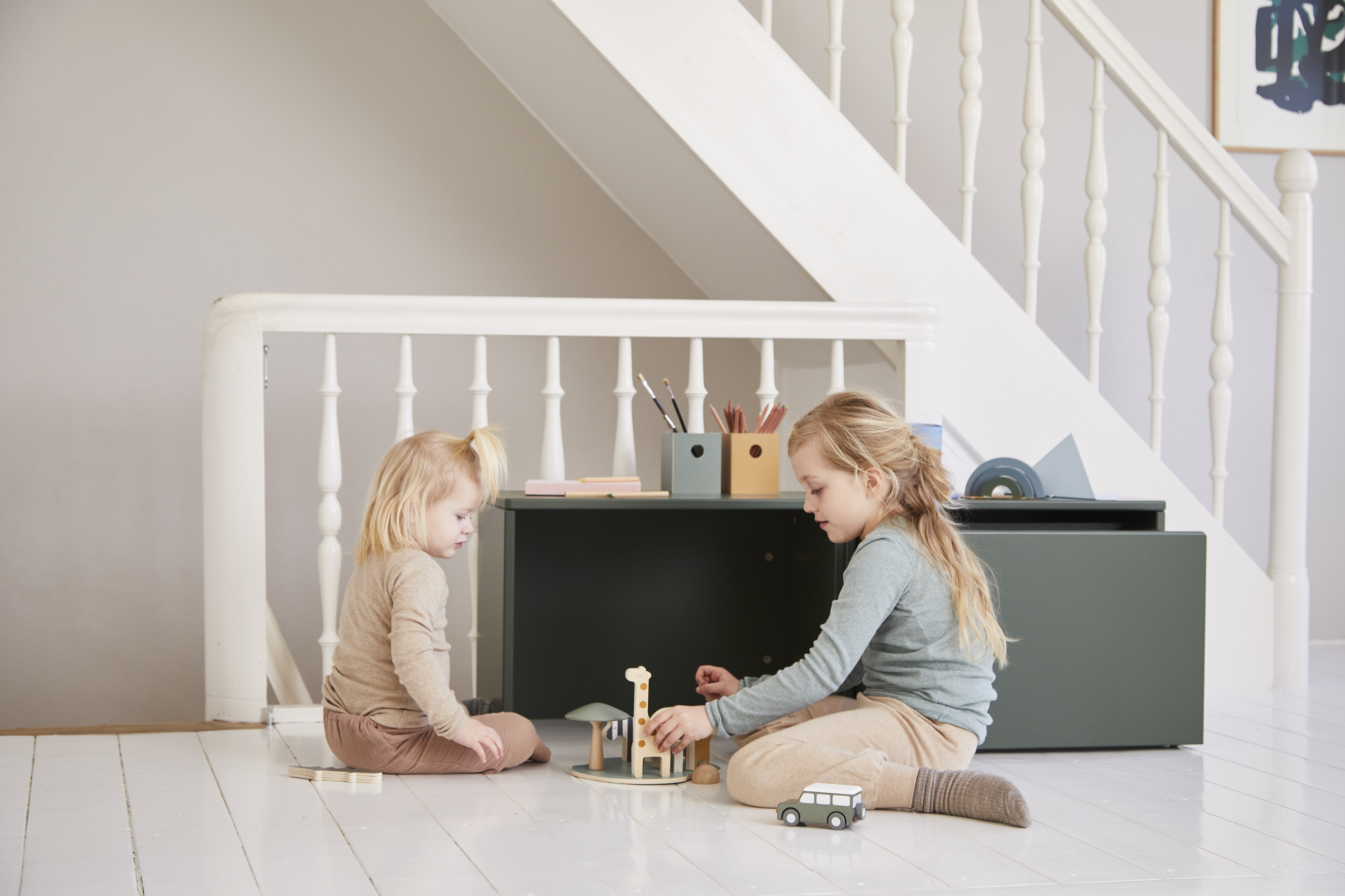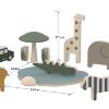 Sættet indeholder: en jeep, et vandhul, græs, et træ og fem safaridyr – en elefant, en løve, en giraf, en zebra og en krokodille. Alle dyrene er lavet i virkelighedstro farver og former, for at sikre genkendelighed. De er designet til små hænder, og de bløde, afrundede hjørner betyder, at de er sikre og rare for dit barn at lege med. Som med alt vores legetøj er jeepen og safaridyrene fremstillet af robuste, langtidsholdbare materialer, så de kan holde til at blive leget med i mange år.