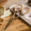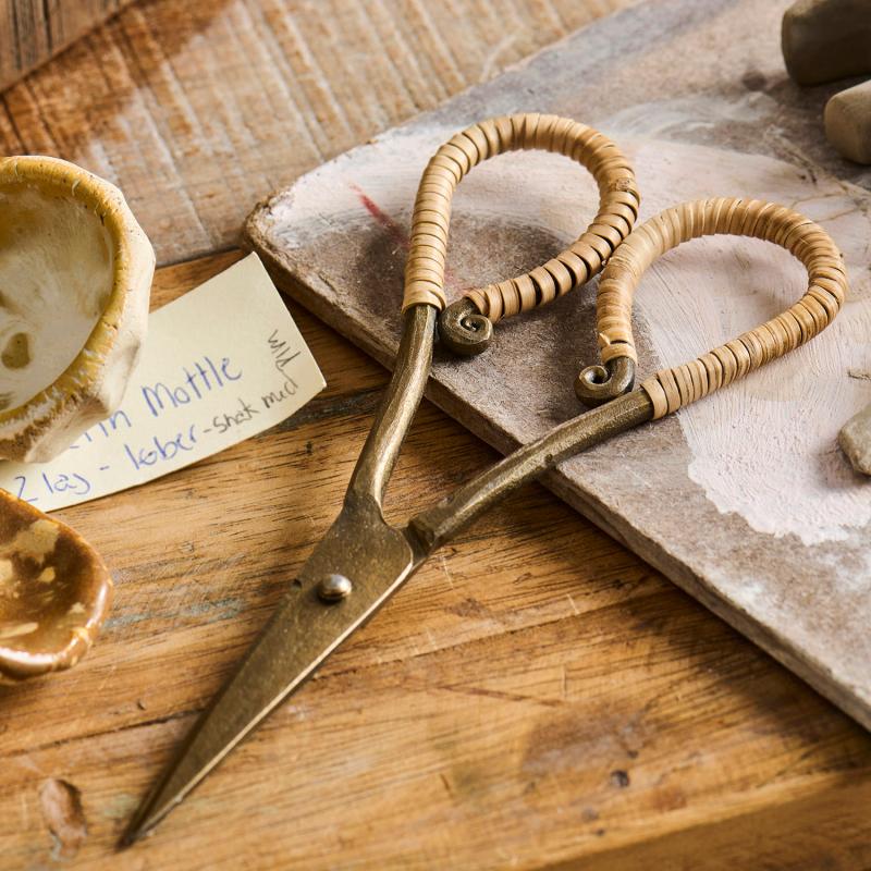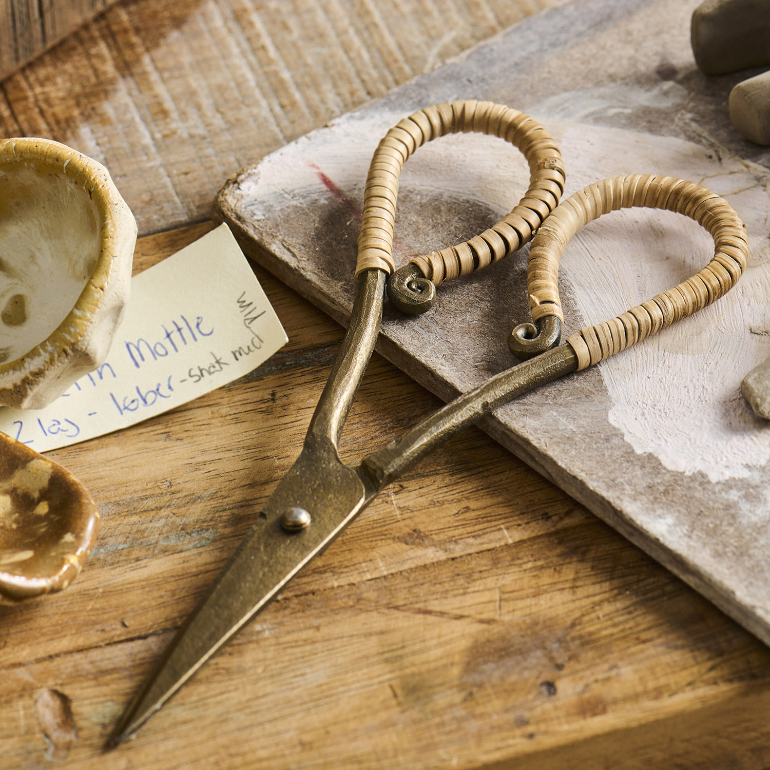 Smuk rustik saks, som egner sig godt til krea-rummet eller orangeriet. 17,8 cm lang. Håndtaget er beviklet med rattan.