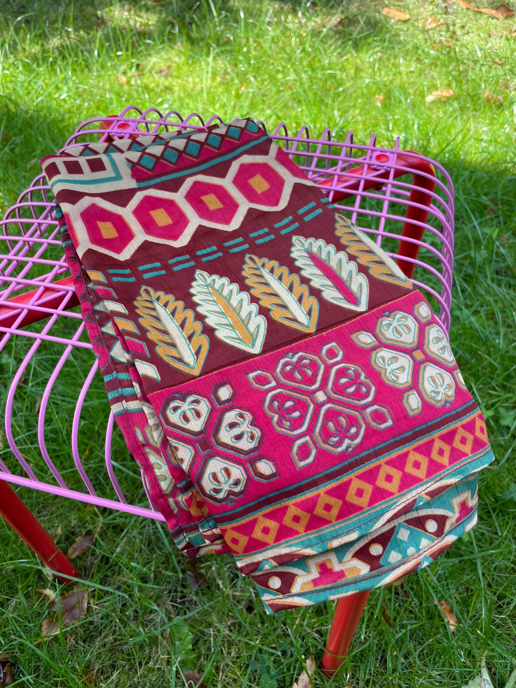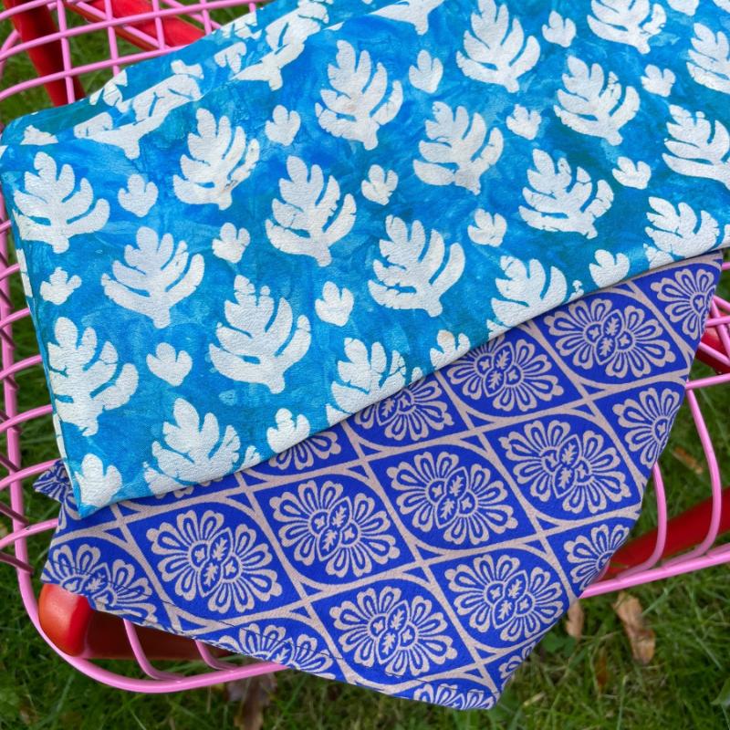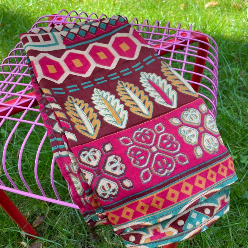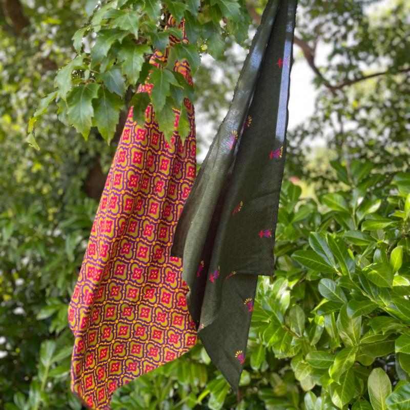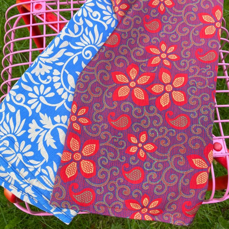 Materiale: Udvalgte stykker af genanvendte sarier i letvægtsmateriale. Hver enkelt tørklæde er unikt.