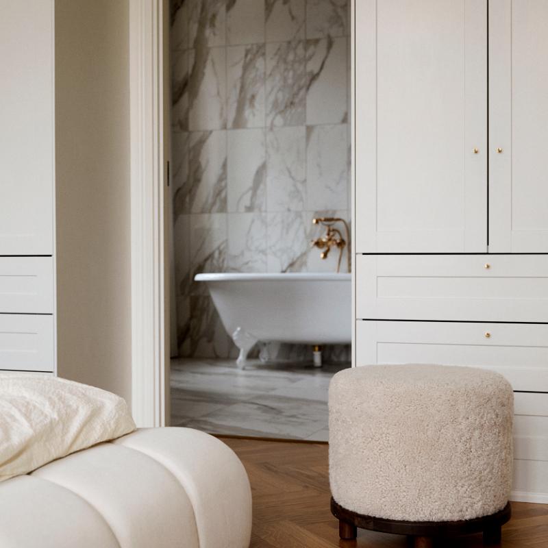 arrow_backTil oversigtenPuffen er et hyggeligt og dekorativt element i indretningen. Den fås både i rund og firkantet, og er lavet af kort og krøllet lammeskind, der giver puffen et behageligt udtryk.