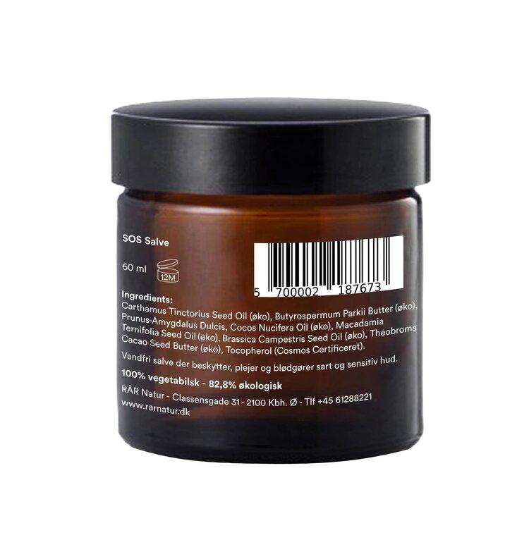 arrow_backTil oversigtenRÂR Natur SOS Salve er en 100% vegetabilsk og vandfri salve der forebygger, plejer og heler tør hud. Den kan benyttes af alle, både børn og voksne.