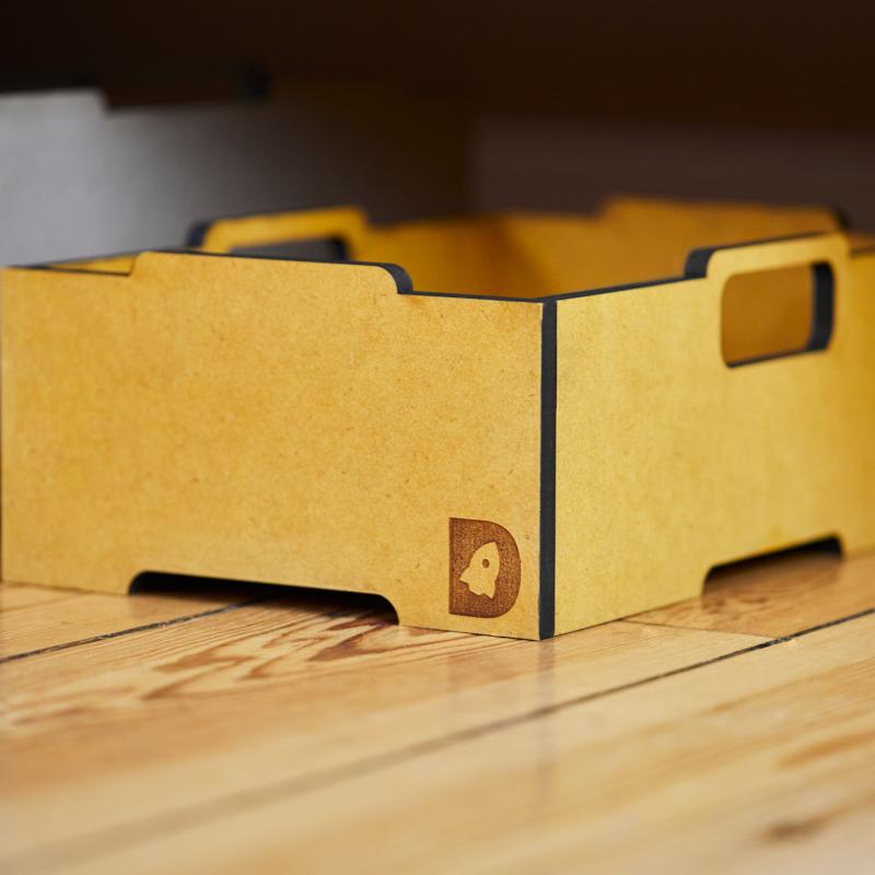 Stabelkasserne er lavet i træ indfarvet med naturfarve og limet med harpikslim. Det gør dem fugtfaste, plus at kasserne har samme farve hele vejen igennem. Derfor ses ridser og skrammer ikke så tydeligt.
