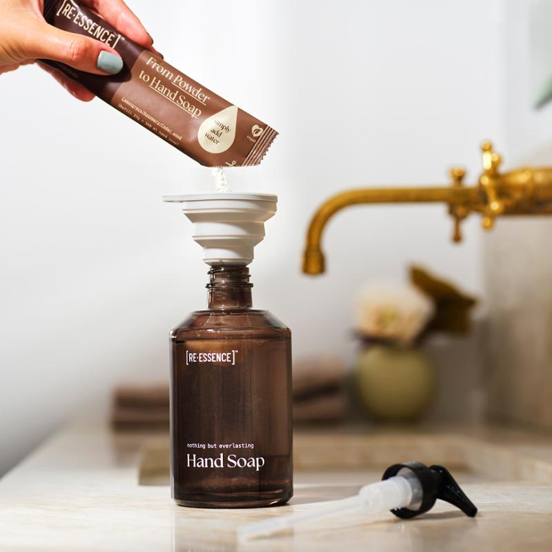 Med kun de bedste håndplukkede ingredienser har vi udviklet et banebrydende koncentrat i pulverform. Når det blandes med vand, forvandler det sig til en luksuriøs og nærende håndsæbe af 98% naturlig oprindelse.