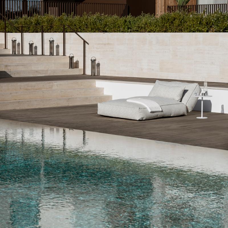 STAY udendørsmøblerne leveres som standard med en robust 2-lags premium base. Det vandafvisende og hurtigtørrende betræk beskytter det indvendige vandtætte lag mod skader. Gulvoverfladens særlige materialeegenskaber sikrer, at meldugpletter ikke kan få fat.