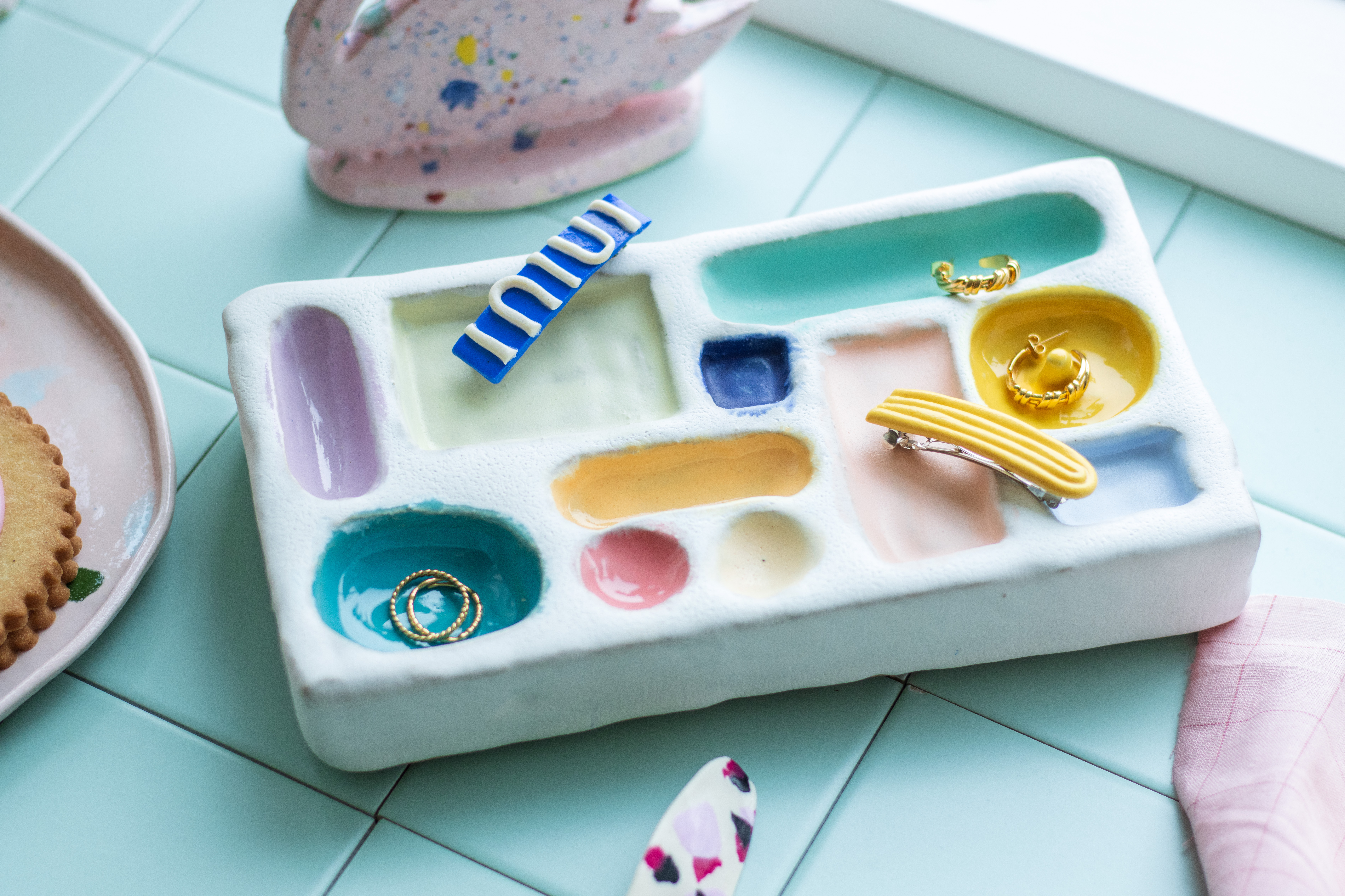 Annemette har lavet disse fine smykkeholdere ud fra et ønske om at de små farvede fordybninger skal indeholde og fremvise hvert enkelt smykke på smukkeste vis.