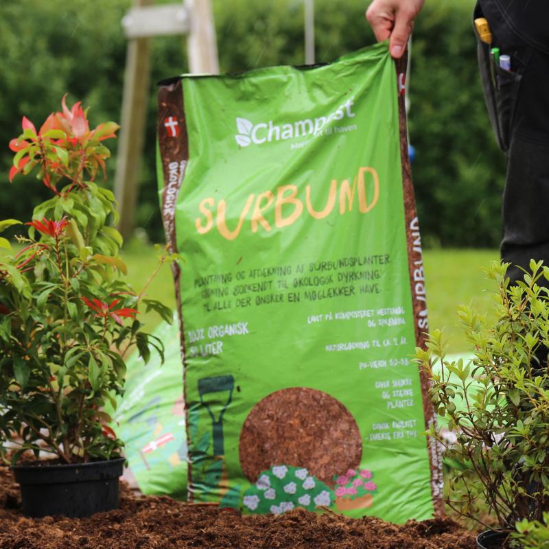 Champost Surbund består af komposteret plantemateriale fra nåleskov, grov spagnum og Champost Jordforbedring. En porøs organisk gødning som langsomt og naturligt frigives til planten. Gødningen optager vand, hvilket minimerer fordampningen til gavn for planten.