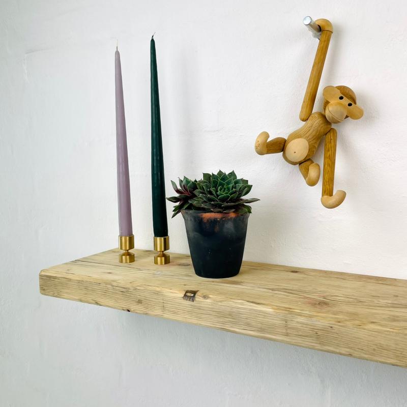 Hylderne er lavet af upcyclede stilladsplanker fra industrien, hvilket gør hvert produkt unikt med personlige brugsspor fra dets tidligere liv.