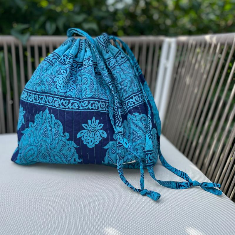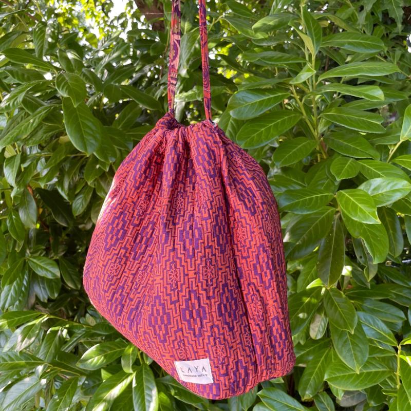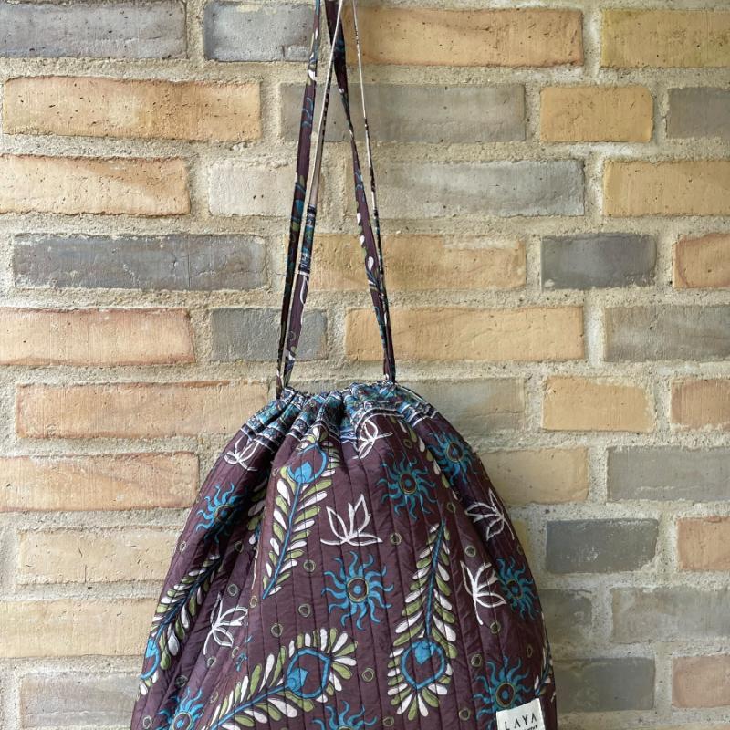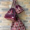 Materiale: Upcyclede sarier med bomuldsfoer og snørelukning.