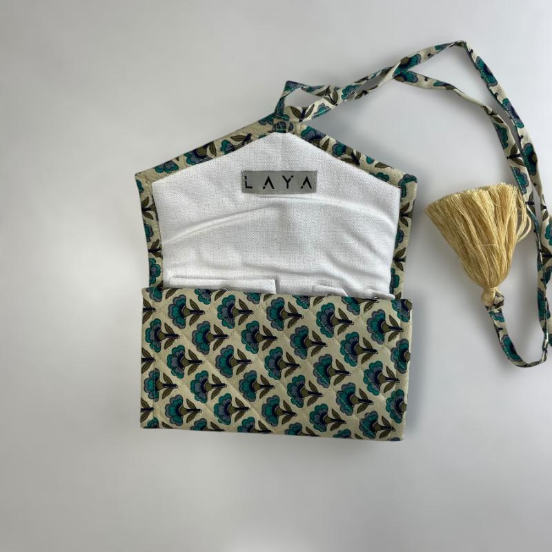 Tarini Jewelry Pouch er en håndsyet smykkepose lavet af upcyclede sarier i Nepal. Hver pose er unik og syet af kvinder, der gennem arbejdet opnår økonomisk uafhængighed. Designet er funktionelt med to inderlommer og blød vattering – ideel til rejser eller daglig opbevaring. Tarini forener håndværk, bæredygtighed og empowerment i ét poetisk og praktisk produkt.
