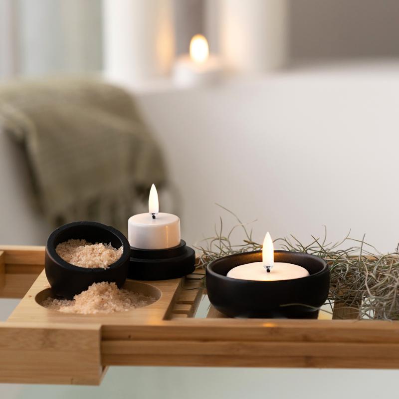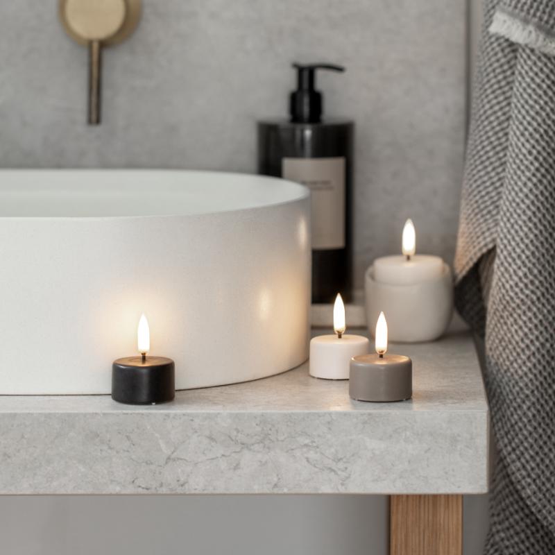 arrow_backTil oversigtenOplev det ekstraordinære Tealight 400 Candle - nu udstyret med en fantastisk batterilevetid på cirka 400 timer! Det lyser i ca. 60 dage sammenlignet med Tealight 120, der lyser i 25 dage (v/ 6 timer om dagen). Fordi det nye fyrfadslys - som noget nyt - er smukt dyppet i voks, er det lidt større end et almindeligt fyrfadslys. Men det er så fint at se på, at du sagtens kan være kreativ og bruge dem uden en stage. Fyrfadslysene er uparfumerede og med alle de smarte funtioner som resten af kollektionen: Fjernbetjening (valgfri), timer og lysdæmpning.