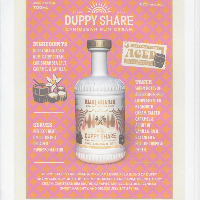 arrow_backTil oversigtenThe Duppy Share Aged rom, en blend fra både Worthy Park og Four Square i Carrabean. Nu Storebritanniens mest solgte uafhænging rom brand. Også som Spiced Rom, XO 12års rom, White rom og nu, som rom likør med ægte fløde og salt karamel. Ingen begrænset holdbarehed på Duppy Cream Liqueur, dog 2 år efter åbning.
