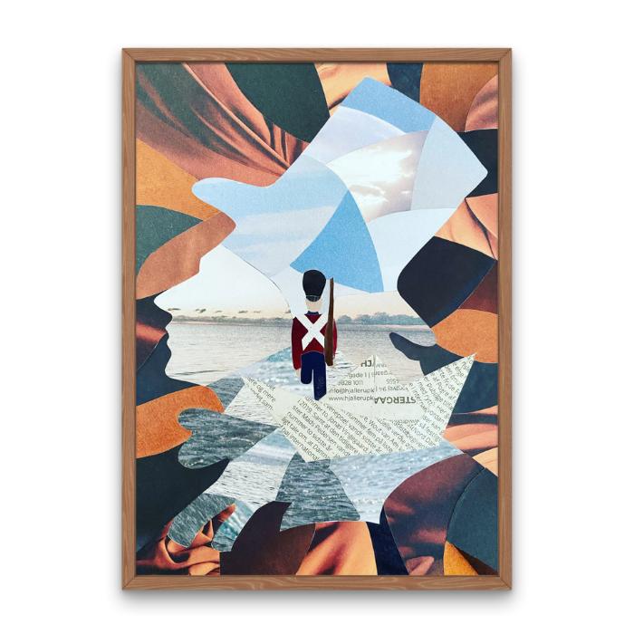Originalen er lavet af små stykker papir fra blade, magasiner og avispapir. Den standhaftige tinsoldat står etbenet i avispapirbåden, der sejler afsted i en silhuet af forfatteren til eventyret. Med noget der minder om flammer omkring H.C. Andersen aner man hvad der venter tinsoldaten.