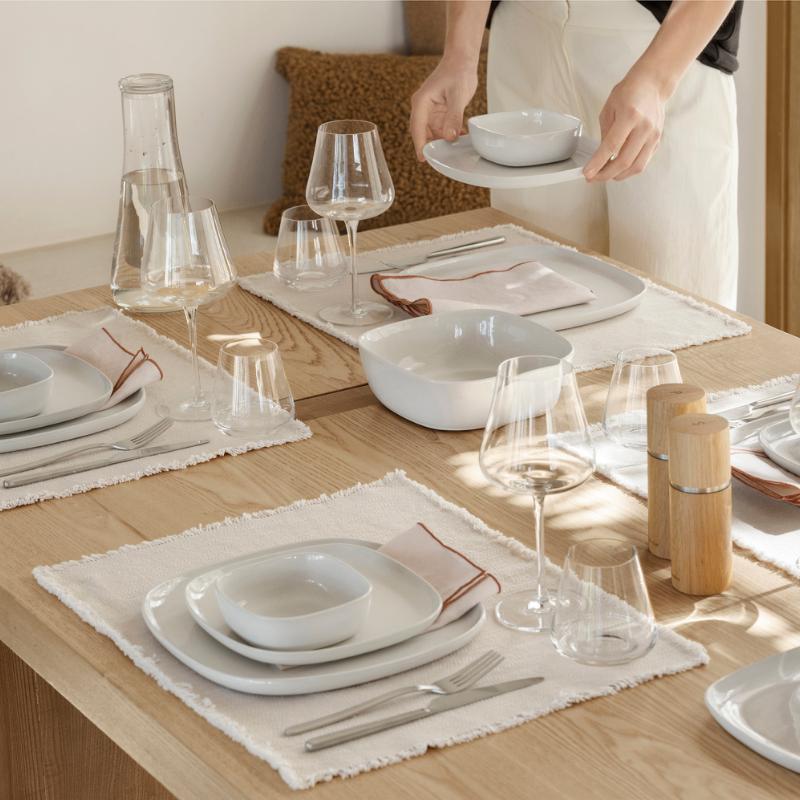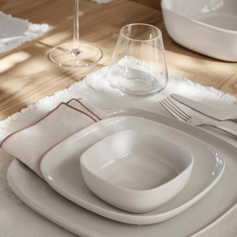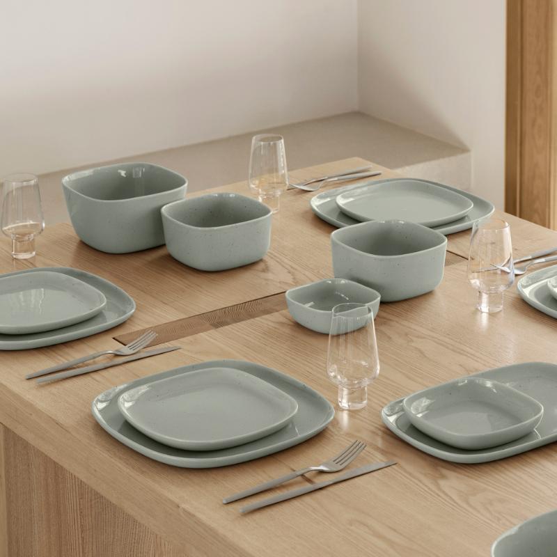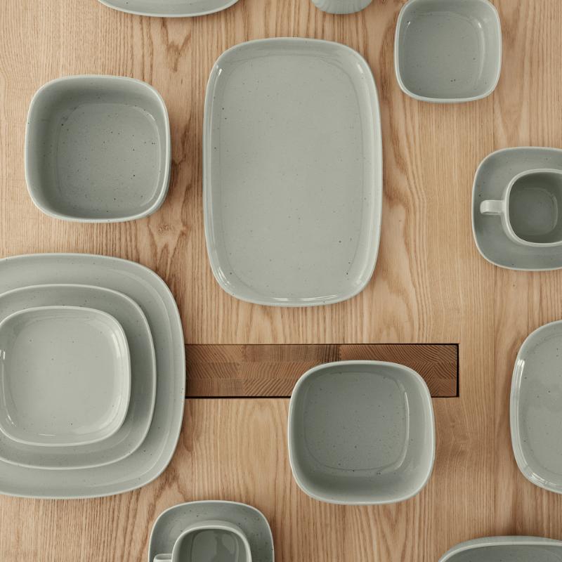 arrow_backTil oversigtenEnkel, elegant og blød - disse ord beskriver perfekt den nye VAHLO stelserie af den tyske designer Sebastian Herkner. De afrundede hjørner gør designet specielt og adskiller det fra klassiske runde porcelænsserier. Serien, der består af otte forskellige produkter, er lavet af højkvalitets stentøj, som forfines af den blanke glasur og præsenterer de enkle farver Moonbeam og Mirage Grey i et elegant skær. VAHLO brændes ved 1200°C og består af tallerkener i forskellige størrelser, skåle, salatskåle, et krus og et sæt med to kaffekopper.