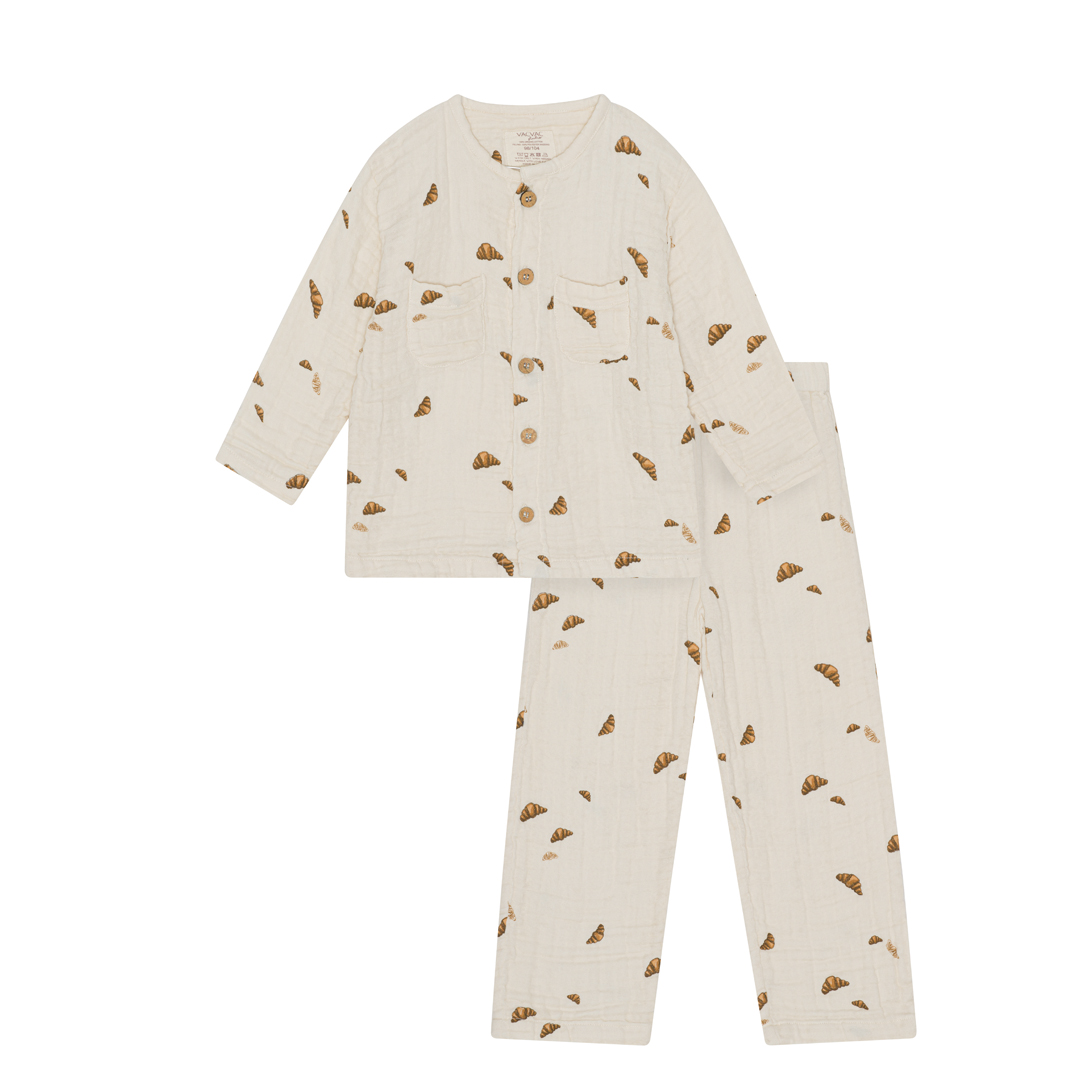arrow_backTil oversigtenOversize pyjamas - cardigan w. woodbutton at frontpanel. pants w. elastic in waist regular fit. 100% organic cotton, muslin. GOTS certified.
